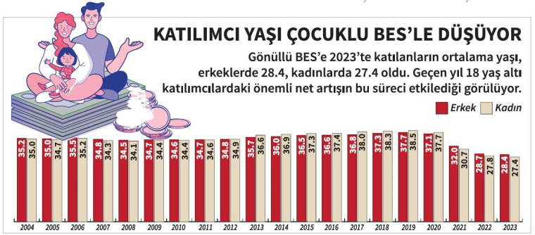 - Öte yandan Türkiye’de Haziran 2021’de uygulaması başlatılan ve 18 yaş altı çocukların gönüllü BES’e dahil edilmesini hedefleyen “çocuklu BES”teki gelişme ise daha hızlı. 19 Ocak itibarıyla açıklanan verilere göre çocuklu BES’teki net katılımcı sayısı 423 bin 385 kişi artarak 1 milyon 42 bin 992’ye yükseldi. Devlet katkısı dahil fon büyüklüğü de geçen yılın aynı dönemine göre yüzde 302 artarak 13.3 milyar lira oldu.