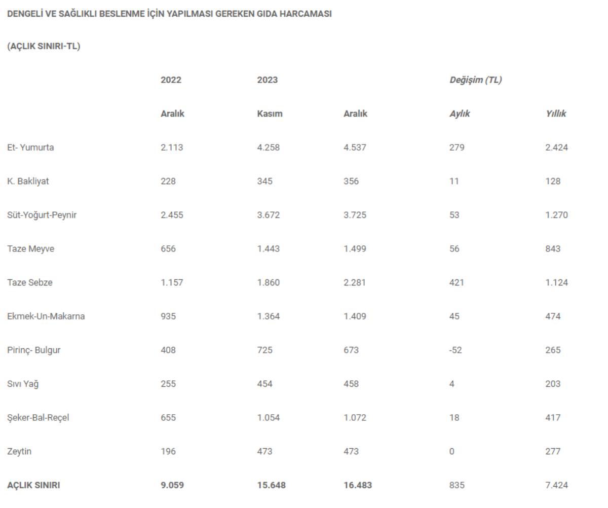 Yetişkin erkek için 2 bin 800, yetişkin kadın için 2 bin 200, genç için 3 bin ve çocuk için de 1600 kalori esas alınarak yapılan hesaplamaya göre 2023 yılı sonunda açlık sınırı yetişkin erkek için 4 bin 813 lira, yetişkin kadın için 3 bin 778 lira, çocuk için 2 bin 748 lira ve genç için de 5 bin 149 lira oldu.
