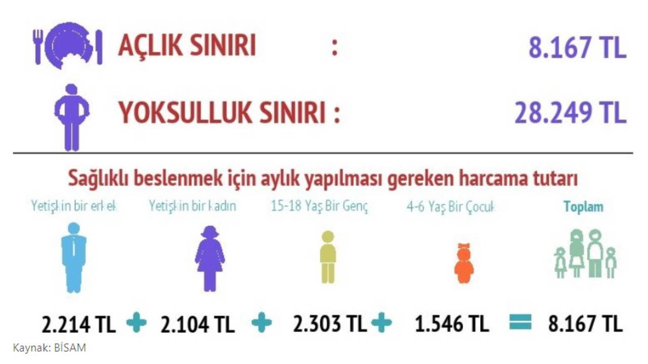 Buna göre, do¨rt kis¸ilik bir ailenin sagˆlıklı ve dengeli beslenmesi ic¸in aylık yapması gereken harcama tutarı (açlık sınırı) 2022 Kasım’da 7 bin 818 TL iken, aralık ayında 8 bin 167 TL’ye yükseldi.