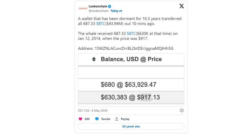 Lookonchain verilerine göre 10 yıldır hareketsiz kalan bir cüzdan, yaklaşık 44 milyon dolar değerindeki Bitcoin’lerini başka bir adrese transfer etti.