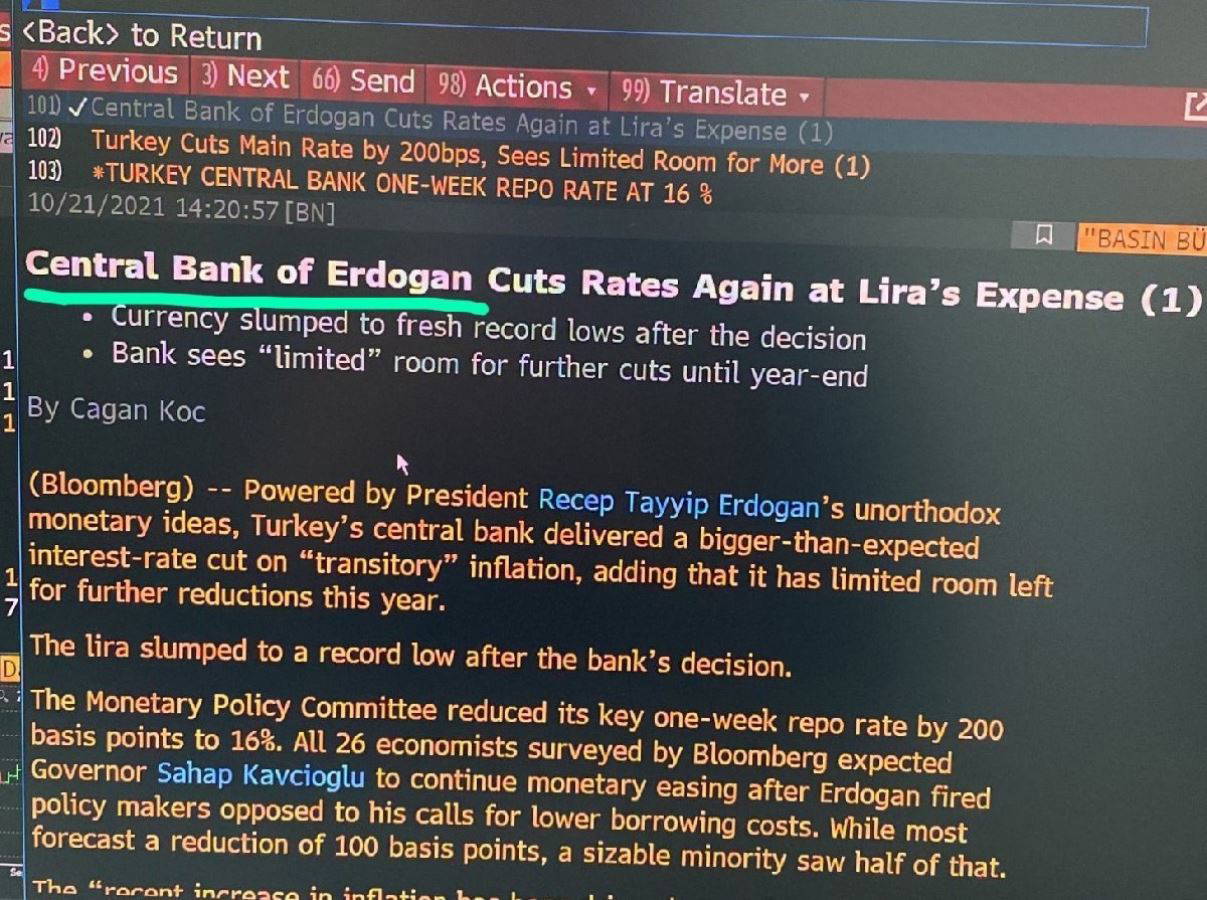 ABD merkezli haber kuruluşu Bloomberg, “Erdoğan’ın merkez bankası yine lira pahasına faiz indirimi yaptı” başlıklı haberinde, “Cumhurbaşkanı Recep Tayyip Erdoğan’ın alışılmışın dışında parasal fikirleri tarafından desteklenen TCMB, ‘geçici’ enflasyonda beklenenden daha büyük bir faiz indirimi gerçekleştirdi” ifadelerine yer verdi.