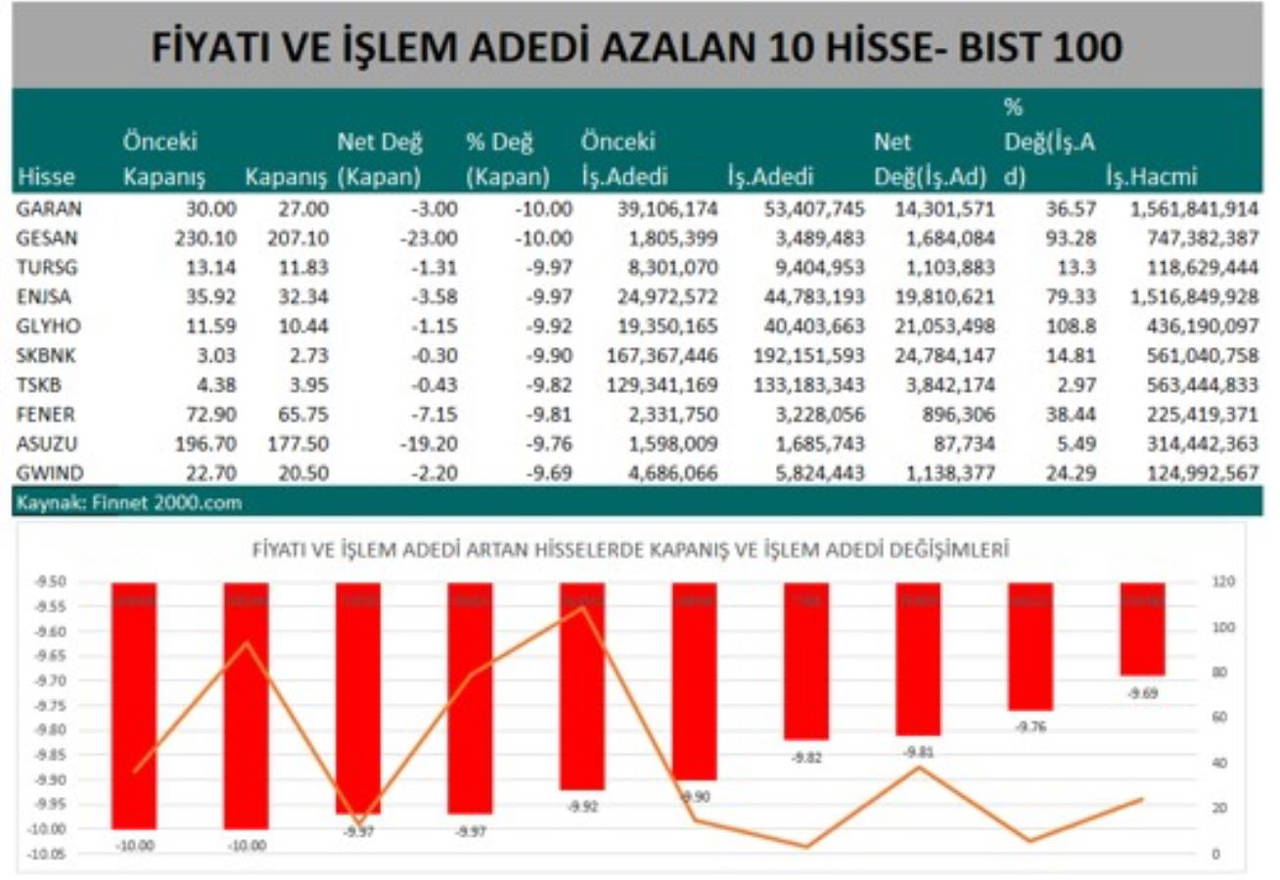 Fiyatı ve işlem adedi azalan 10 hisse şöyle: