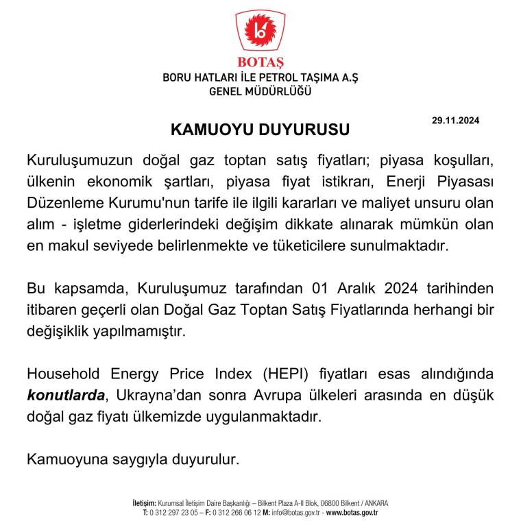 BOTAŞ'ın internet sitesinde yayımlanan tarife tablosuna göre, doğalgazda aralıktan geçerli olacak mesken ve sanayi abonelerinin tarifesi ile elektrik üretim amaçlı tarife sabit kaldı.