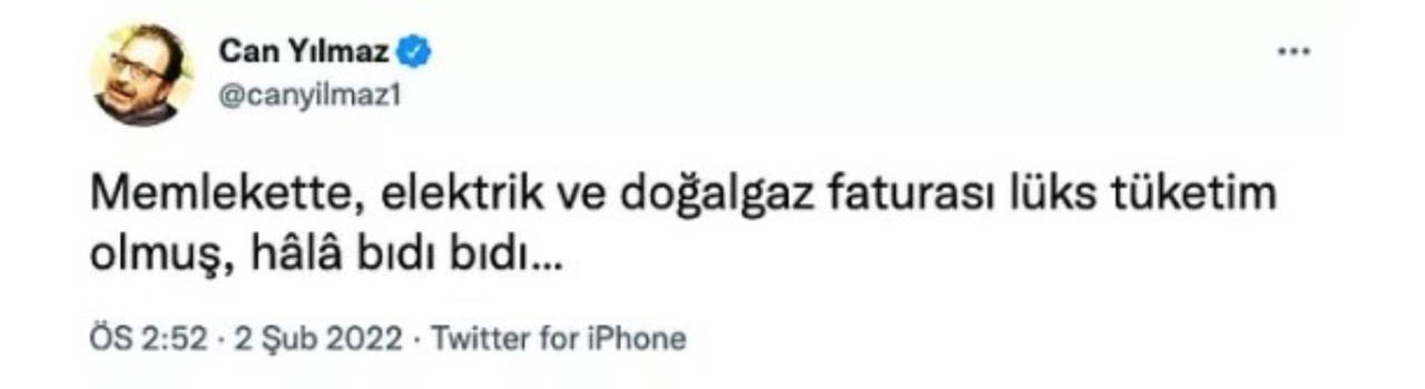 Oyuncu ve senarist Can Yılmaz, Twitter hesabından yaptığı bir paylaşımla elektrik zamlarına sert tepki gösterdi.