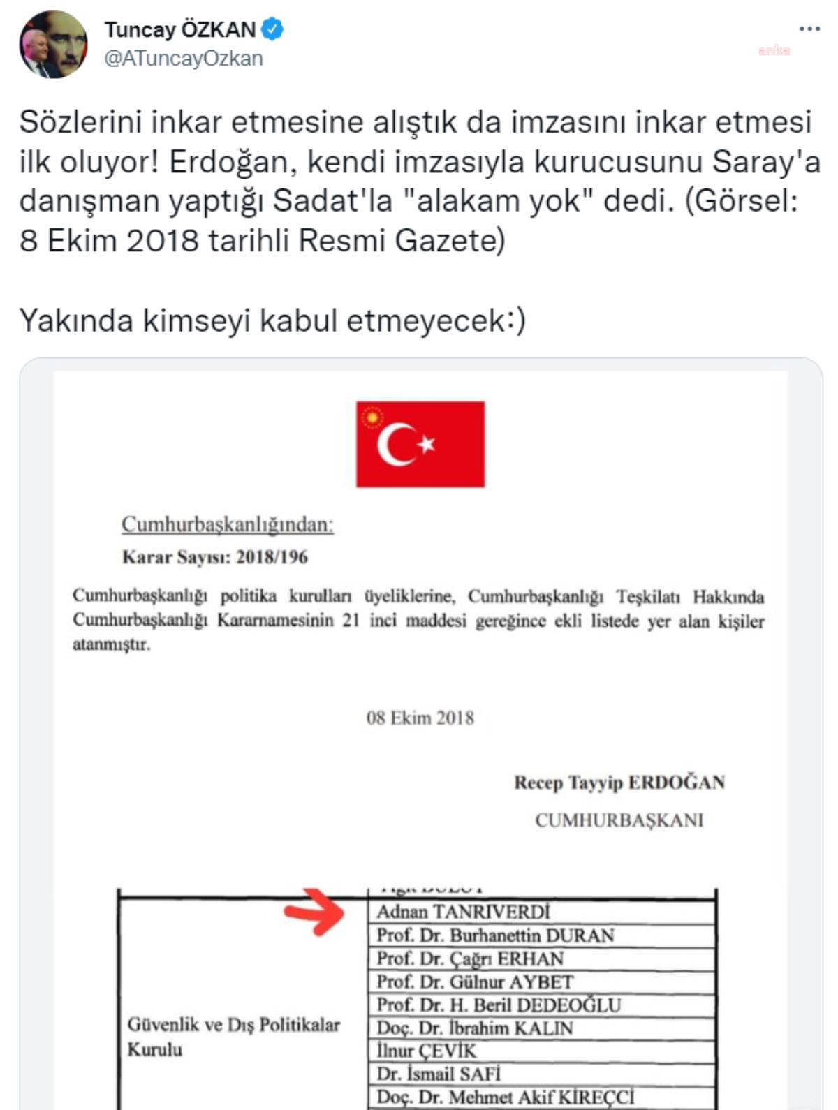 “Sözlerini inkar etmesine alıştık da imzasını inkar etmesi ilk oluyor! Erdoğan, kendi imzasıyla kurucusunu Saray'a danışman yaptığı Sadat'la ‘alakam yok’ dedi. (Görsel: 8 Ekim 2018 tarihli Resmi Gazete) Yakında kimseyi kabul etmeyecek.”