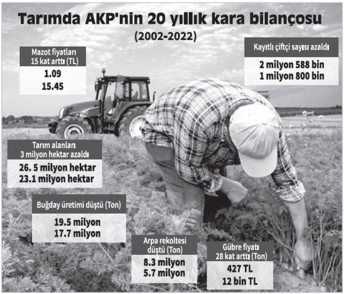 Üreticiye göre iktidarda olduğu 20 yıl boyunca 16’dan fazla politika, altı bakan değiştiren AKP, tarıma yeterince destek vermedi. Bu nedenle gıda enflasyonunun önüne geçilemediğini söyleyen Türkiye Ziraatçılar Derneği Başkanı Hüseyin Demirtaş, KDV indirimi, marketlerde zabıta denetimi gibi önlemler yerine tarladaki yangına müdahale edilmesi gerektiğini belirtti.