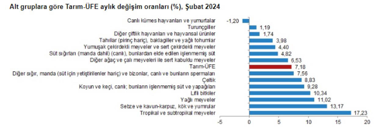 Tarım-ÜFE'de, 2024 yılı şubat ayında bir önceki aya göre yüzde 7,18 artış, bir önceki yılın Aralık ayına göre yüzde 11,30 artış, bir önceki yılın aynı ayına göre yüzde 58,29 artış ve on iki aylık ortalamalara göre yüzde 60,28 artış gerçekleşti.
