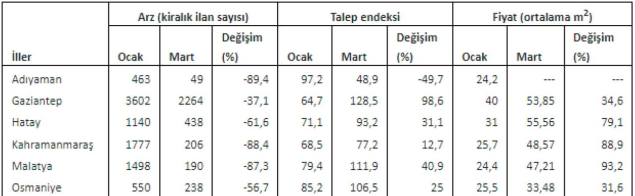 Bu illerdeki konut arzındaki düşüşe karşılık konut talebinde çok farklı seyirler görülmektedir. Kiralık konut talebi Adıyaman’da neredeyse yarıya düştü. Buna karşılık Kahramanmaraş, Osmaniye, Hatay ve Malatya kiralık konut talebinin arttığı iller olarak öne çıkıyor. Gaziantep ise konut talebinin neredeyse iki katına çıkmasıyla diğer illerden ayrışıyor.