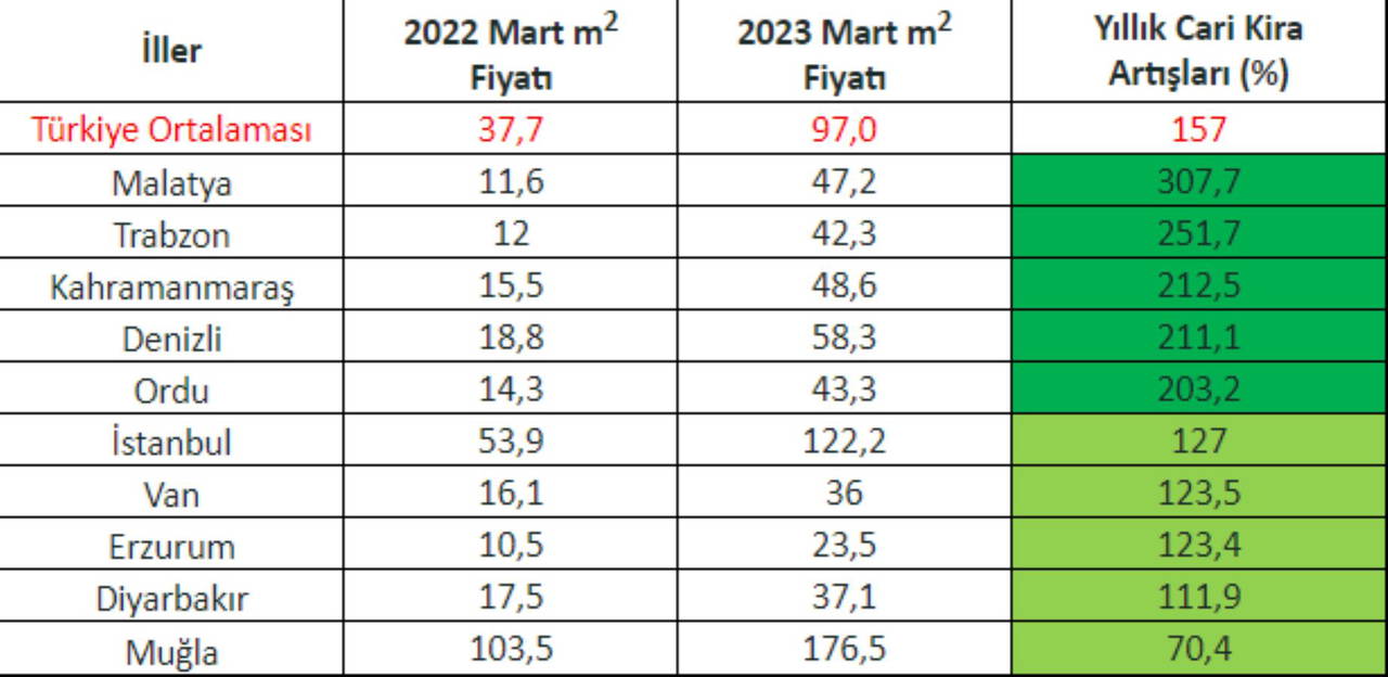 Yüksek kira artış oranında Malatya’yı takip eden iller ise Trabzon, Kahramanmaraş, Denizli ve Ordu oldu. En düşük kira artışının görüldüğü iller de İstanbul, Van, Erzurum ve Diyarbakır oldu.