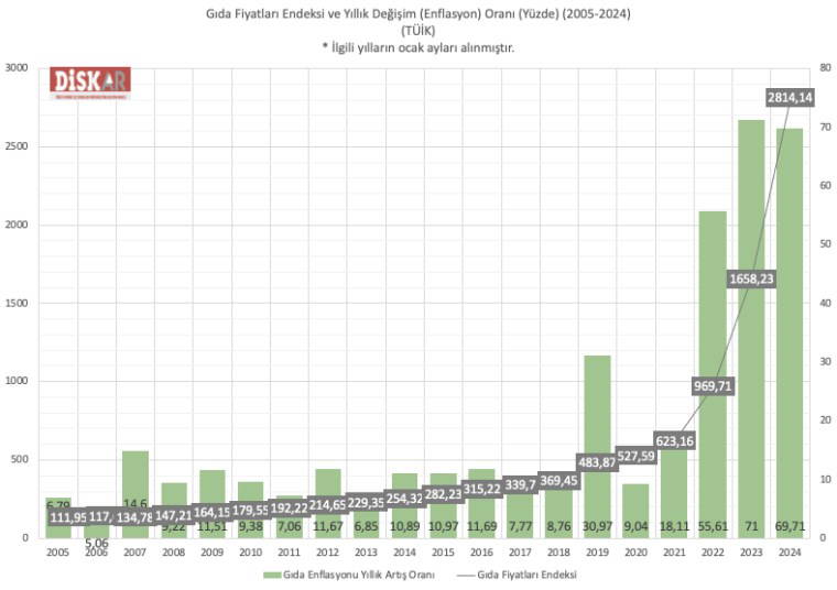 2005’te 111,95 olan gıda fiyatları endeksi ise 2024’te 2.814,14’e yükseldi.