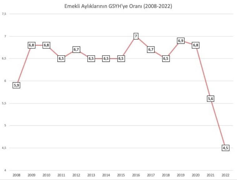 Enflasyon doğru ölçülse, gelir gruplarının enflasyonu dikkate alınsa dahi emekli aylıkları sadece bunlar üzerinden belirlenemez. Gelirde Adalet mücadelemizde defalarca ifade ettiğimiz gibi asıl olan adil bir bölüşümdür. 2019 yılında emekli aylıklarının Gayri Safi Yurt İçi Hasıla’ya oranı yüzde 6,9 iken, emekli sayısı artmasına rağmen bu oran yüzde 4,5’e gerilemiştir. Ülkede yaşanan bölüşüm şokunun en çok mağdur ettiği kesimlerden biri emekliler olmuştur.