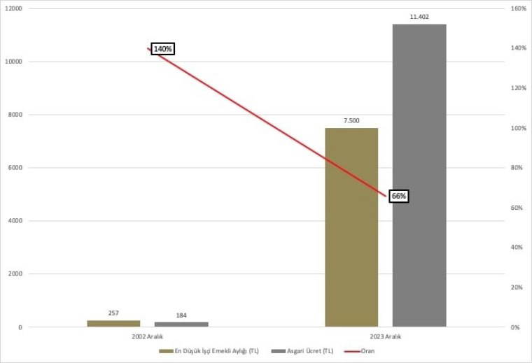 2002 Aralık’ta en düşük işçi emeklisi aylığı asgari ücretin yüzde 40 üzerindeyken, 2023’ün ikinci yarısında asgari ücretin yüzde 66’sına gerilemiştir. (Kök aylık olarak değil, 7500 TL’ye tamamlanarak)