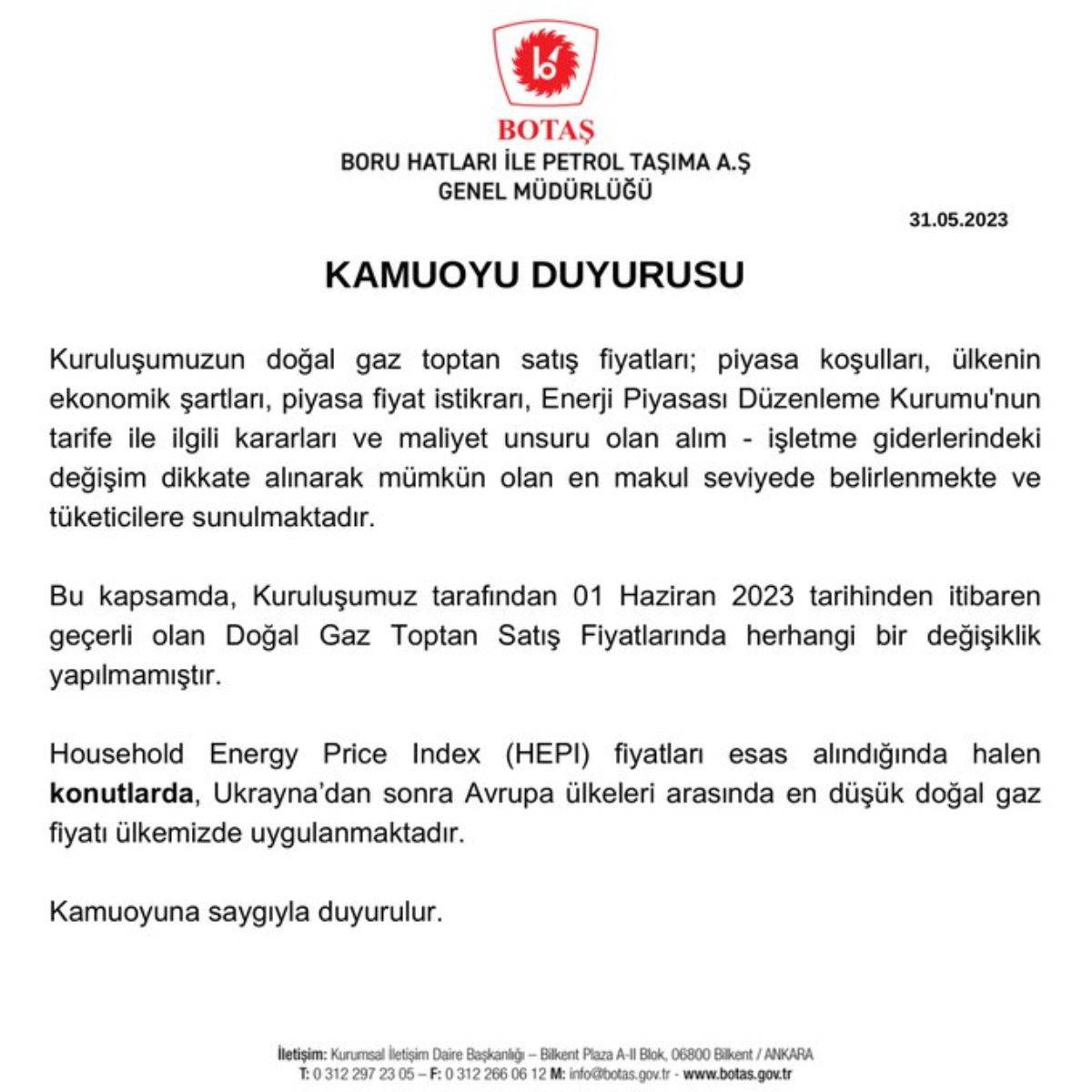 BOTAŞ, 1 Haziran itibariyle geçerli olacak tarifeye ilişkin açıklama yaptı. Sosyal medya hesabından yapılan duyuruda, bugünden itibaren doğalgazda herhangi bir zam olmayacağı açıklandı.