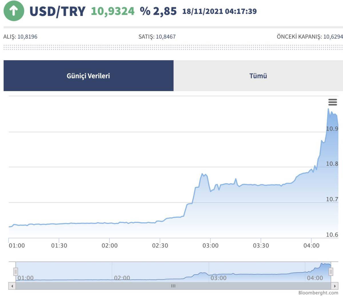 Sputnik'in haberine göre; Yükseliş devam ederken, dolar/TL kuru saat 4.20 sıralarında 10.93'e ulaştı. Dolar, saat 7.30 itibarıyla ise 10.85'e geriledi.