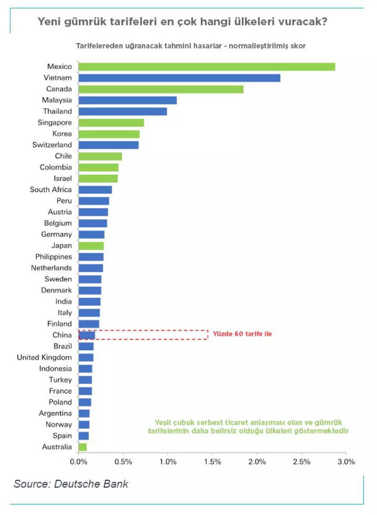 Deutsche Bank FX araştırmaları birimi, Donald Trump döneminde olası yeni ticaret savaşlarının hangi ülkeleri ne kadar etkileyeceğine dair bir analiz ve grafik hazırladı. Analize göre, global ölçekte uygulanacak yeni gümrük tarifelerinin doğrudan en çok etkileyeceği ülke Çin olmayacak. Ancak ABD'nin artıracağı tarifelerin Dünya Ticaret Örgütü (DTÖ) ve Avrupa Birliği ülkeleri nezdinde yaratacağı ikincil kararlar, Çin için ciddi ekonomik zorluklar yaratabilir.