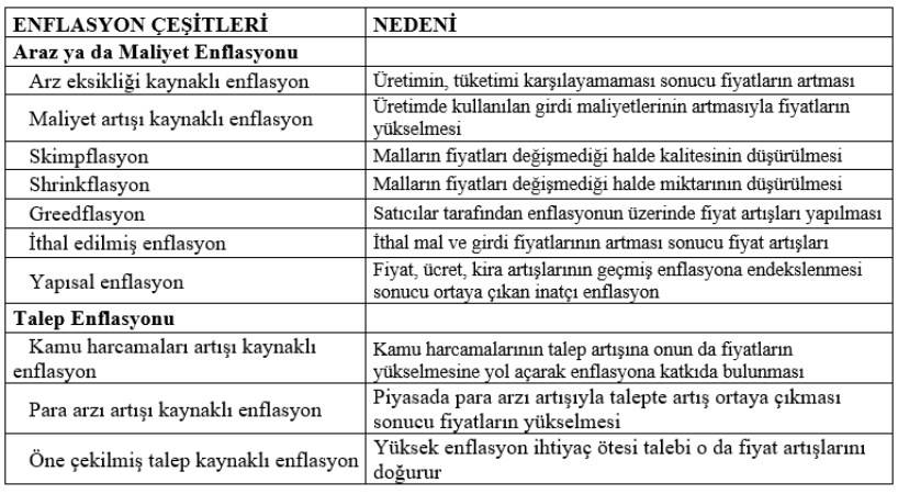 Enflasyon asıl olarak ya üretim maliyetlerinin sürekli olarak yükselmesinin (arz ya da maliyet enflasyonu) ya da talepteki sürekli artışların (talep enflasyonu) fiyatlara yansımasıyla ortaya çıkar. Bu ikisi dışındaki bütün enflasyon ve enflasyon benzeri olgular bu ikisinin türevleridir. Bunları bir tablo halinde gösterelim: