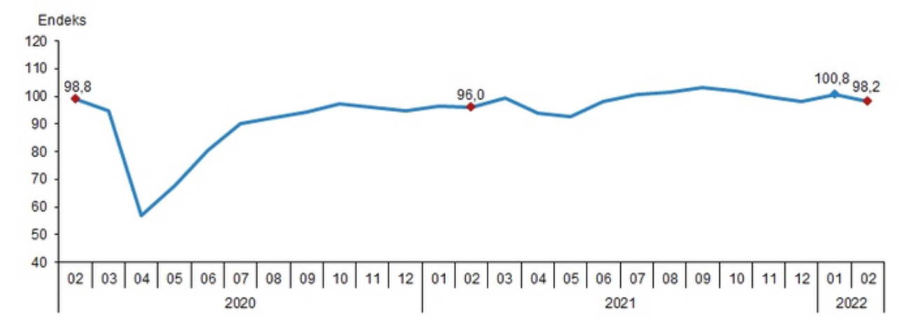 Ekonomik güven endeksi Ocak ayında 100,8 iken, şubat ayında yüde 2,6 oranında azalarak 98,2 değerine düştü. Ekonomik güven endeksindeki düşüş, tüketici, reel kesim (imalat sanayi), hizmet, perakende ticaret ve inşaat sektörü güven endekslerindeki düşüşlerden kaynaklandı.