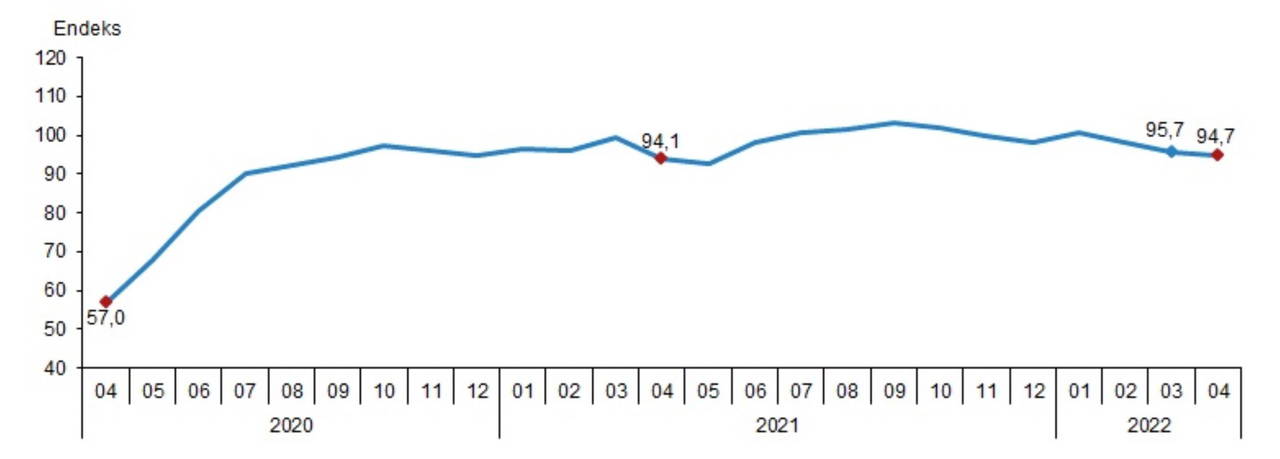 Türkiye İstatistik Kurumu (TÜİK) ekonomik güven endeksi verilerini yayımladı. TÜİK’e göre ekonomik güven endeksi mart ayında 95,7 iken, nisan ayında yüzde 1,1 oranında azalarak 94,7 değerine düştü. Ekonomik güven endeksindeki düşüş, tüketici ve reel kesim (imalat sanayi) güven endekslerindeki düşüşlerden kaynaklandı.