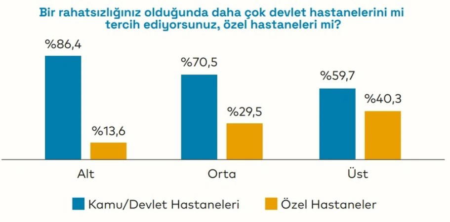 İstanbul Barometresi'nin sağlık hizmetleriyle ilgili bölümünde, katılımcıların yüzde 75,6’sı kamu hastanelerini tercih ettiklerini belirtti. Ancak, gelir seviyelerine göre hizmet kalitesinde büyük bir fark gözlemlendi. Alt gelir grubundakiler devlet hastanelerine güvenmediklerini ifade ederken, üst gelir grubundakiler özel hastaneleri tercih etti.