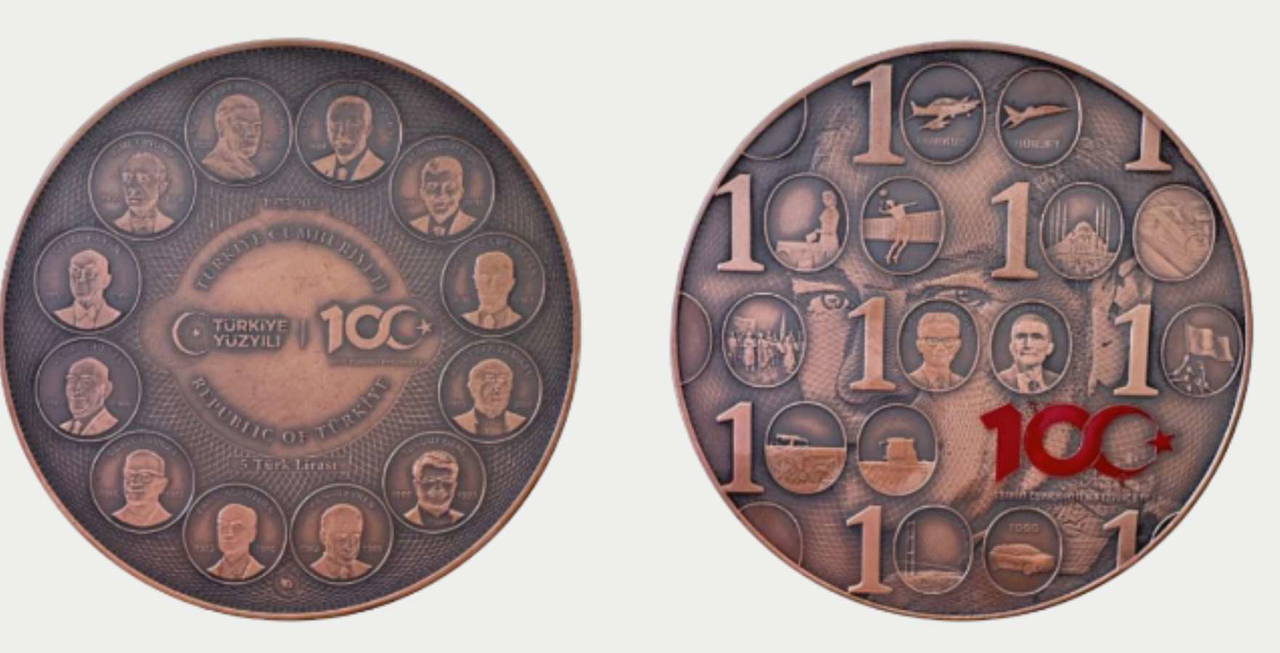 Hazine ve Maliye Bakanlığının, Cumhuriyet'in 100. yılı kapsamında bastırdığı İç göbeğinde iktidarın "Türkiye Yüzyılı" sloganı kullanılan "5 Türk Lirası" hatıra parası bugün tedavüle sunuldu.