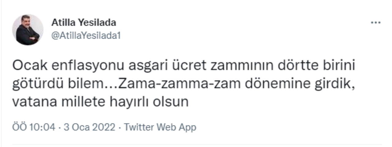 TÜİK'in açıkladığı enflasyon rakamını değerlendiren ekonomist Atilla Yeşilada, ''Ocak enflasyonu asgari ücret zammının dörtte birini götürdü bilem...Zama-zamma-zam dönemine girdik, vatana millete hayırlı olsun'' ifadelerini kullandı.