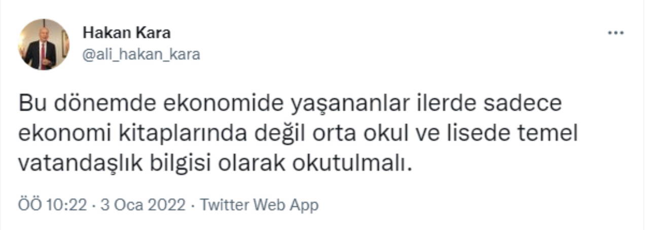 Sosyal medya hesabından paylaşım Ekonomist Hakan Kara, ''Bu dönemde ekonomide yaşananlar ilerde sadece ekonomi kitaplarında değil orta okul ve lisede temel vatandaşlık bilgisi olarak okutulmalı'' paylaşımını yaptı.
