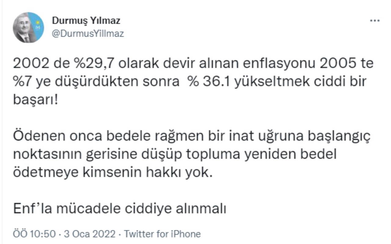 Eski Merkez Bankası Başkanı Durmuş Yılmaz ise, ''2002 de yüzde 29,7 olarak devir alınan enflasyonu 2005'te yüzde 7 ye düşürdükten sonra yüzde 36.1 yükseltmek ciddi bir başarı! Ödenen onca bedele rağmen bir inat uğruna başlangıç noktasının gerisine düşüp topluma yeniden bedel ödetmeye kimsenin hakkı yok. Enf’la mücadele ciddiye alınmalı'' dedi.