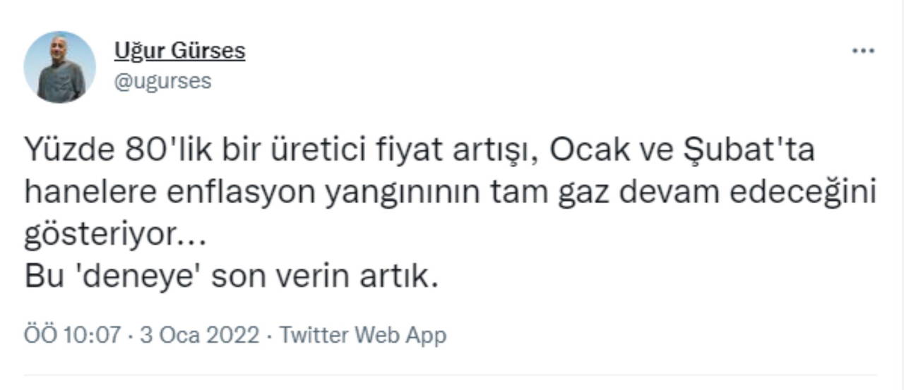 Ekonomist Uğur Gürses, ''Yüzde 80'lik bir üretici fiyat artışı, Ocak ve Şubat'ta hanelere enflasyon yangınının tam gaz devam edeceğini gösteriyor... Bu 'deneye' son verin artık'' ifadelerine yer verdi.