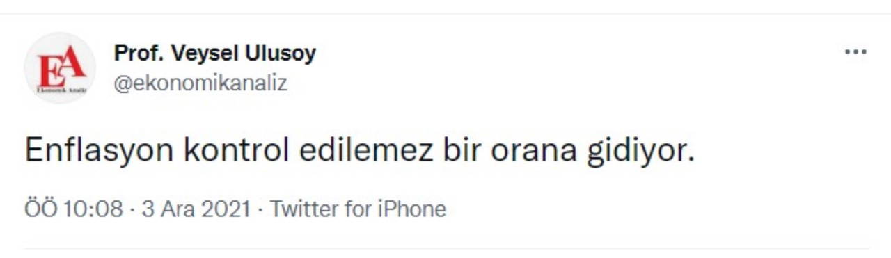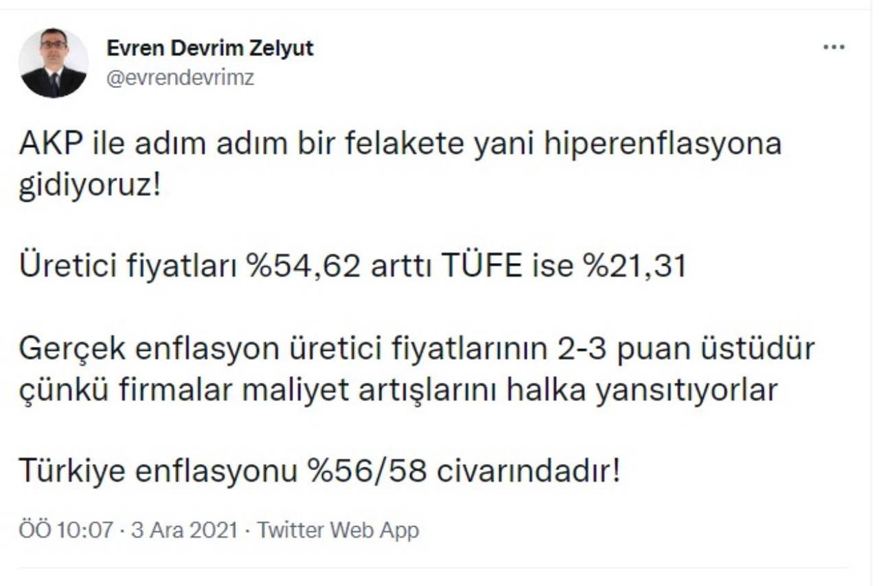 Ekonomist Evren Devrim Zelyut ise, ''AKP ile adım adım bir felakete yani hiperenflasyona gidiyoruz! Üretici fiyatları yüzde 54,62 arttı TÜFE ise yüzde 21,31. Gerçek enflasyon üretici fiyatlarının 2-3 puan üstüdür çünkü firmalar maliyet artışlarını halka yansıtıyorlar. Türkiye enflasyonu yüzde 56/58 civarındadır'' dedi.