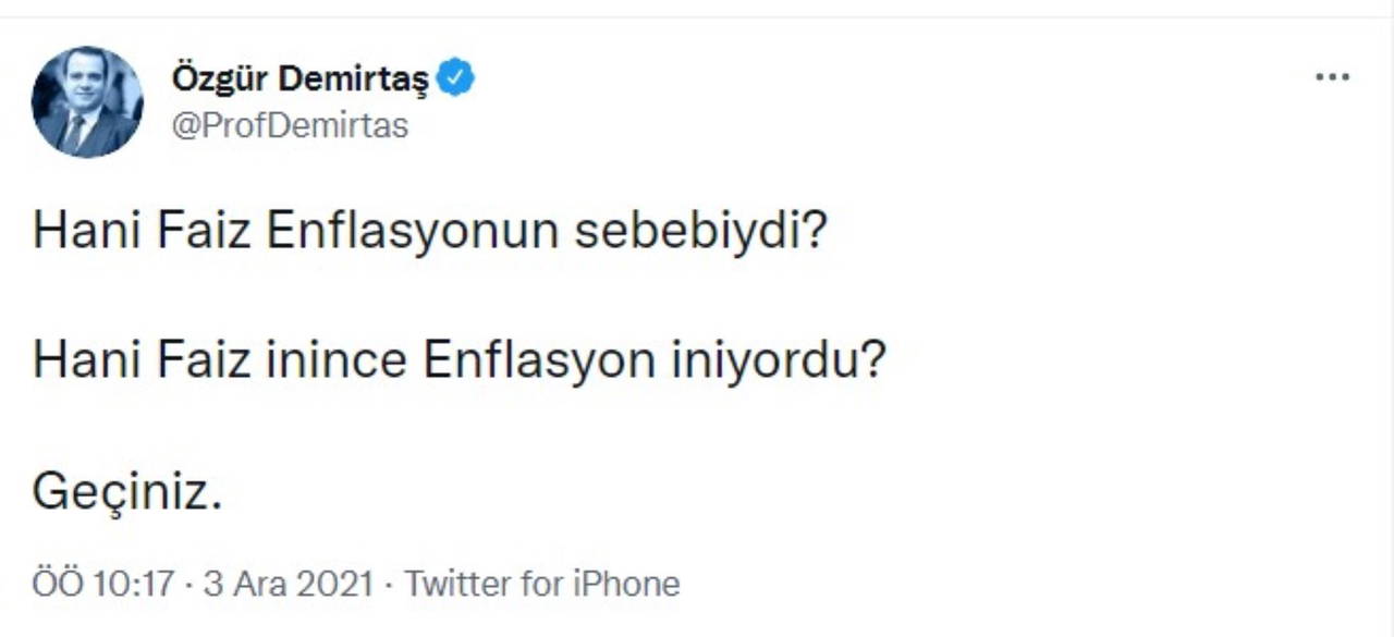 Beklentilerin üzerinde gelen enflasyon verileri sonrası sosyal medya hesabından paylaşım yapan ekonomist Özgür Demirtaş, ''Hani Faiz Enflasyonun sebebiydi? Hani Faiz inince Enflasyon iniyordu? Geçiniz'' diyerek tepkisini dile getirdi.