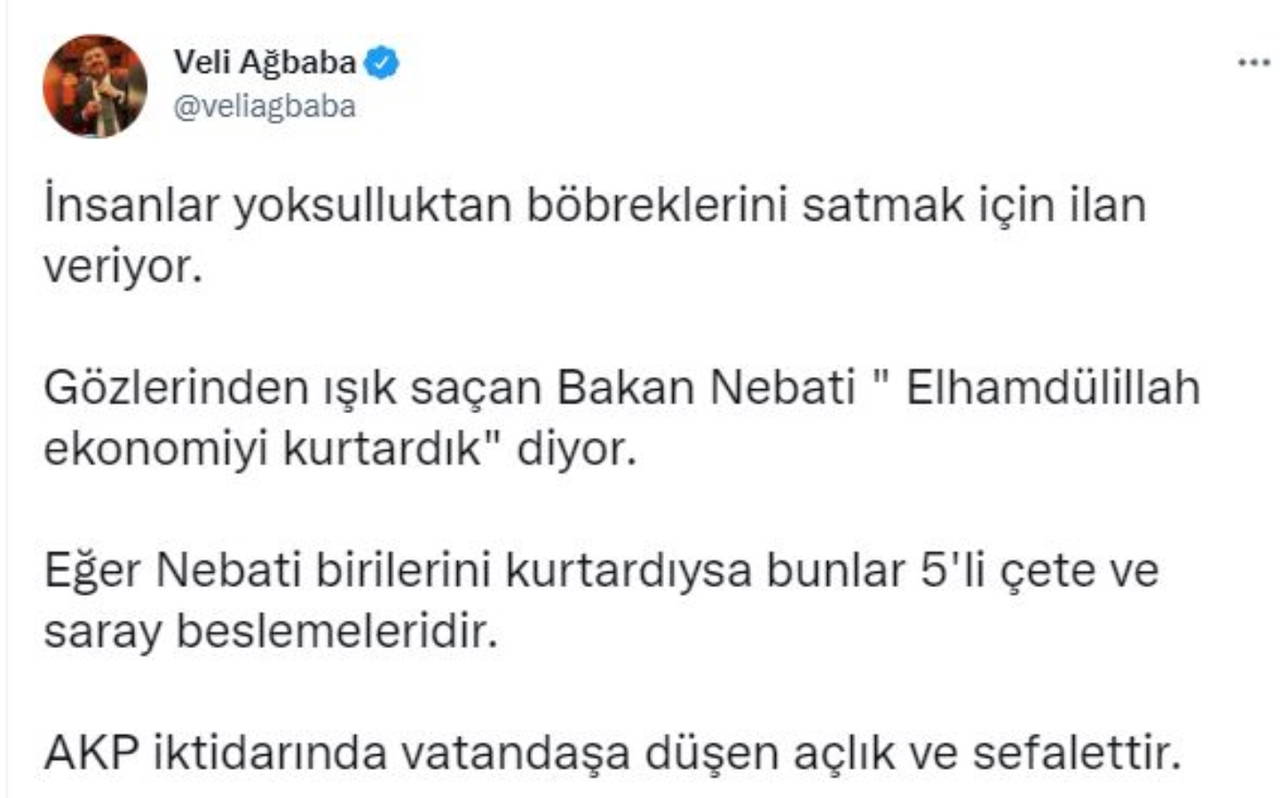 Bakan Nebati'nin "Elhamdülillah ekonomiyi kurtardık" sözlerini hatırlatan CHP Genel Başkan Yardımcısı Veli Ağbaba, yurttaşın yoksulluktan böbreklerini sattığını belirtti.