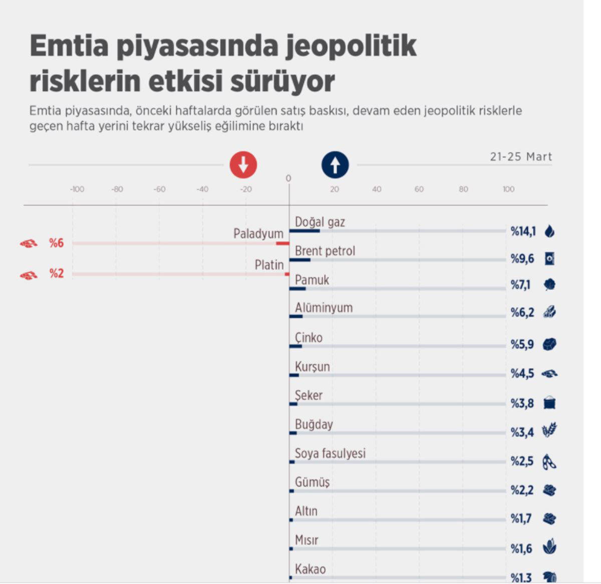 Rusya-Ukrayna savaşının başlamasıyla zirvelerin hakim olduğu emtia fiyatlarında daha sonra düşüşler görülmüştü. Önceki haftalarda ABD Merkez Bankası (Fed) kararları, yeni tip koronavirüs (Covid-19) salgınındaki vaka sayıları ve Rusya-Ukrayna savaşına ilişkin olumlu beklentilerle emtia fiyatları üzerindeki satış baskısı artmıştı.