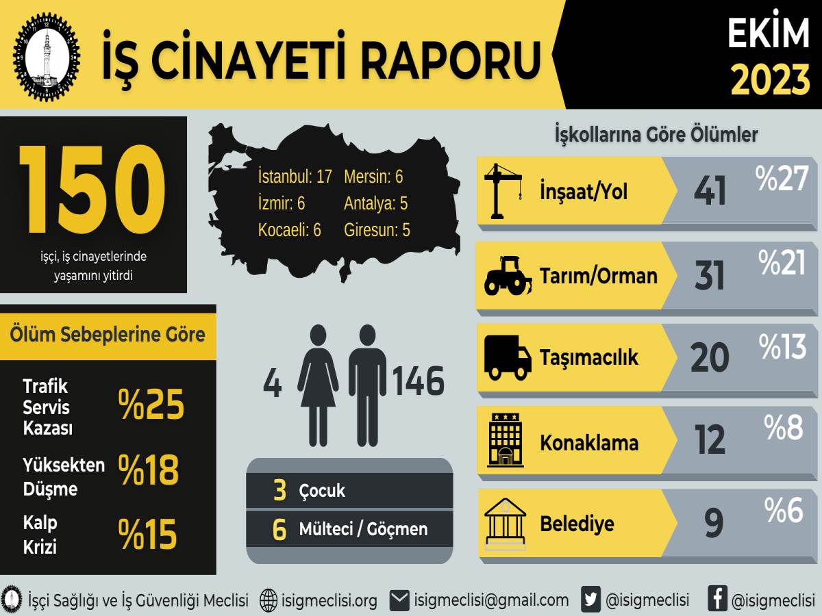İşçi Sağlığı ve İş Güvenliği (İSİG) Meclisi'nin ekim ayı raporu yayınlandı. Rapora göre ekim ayında 150, yılın ilk on ayında ise en az 1634 işçi iş cinayetlerinde yaşamını yitirdi.