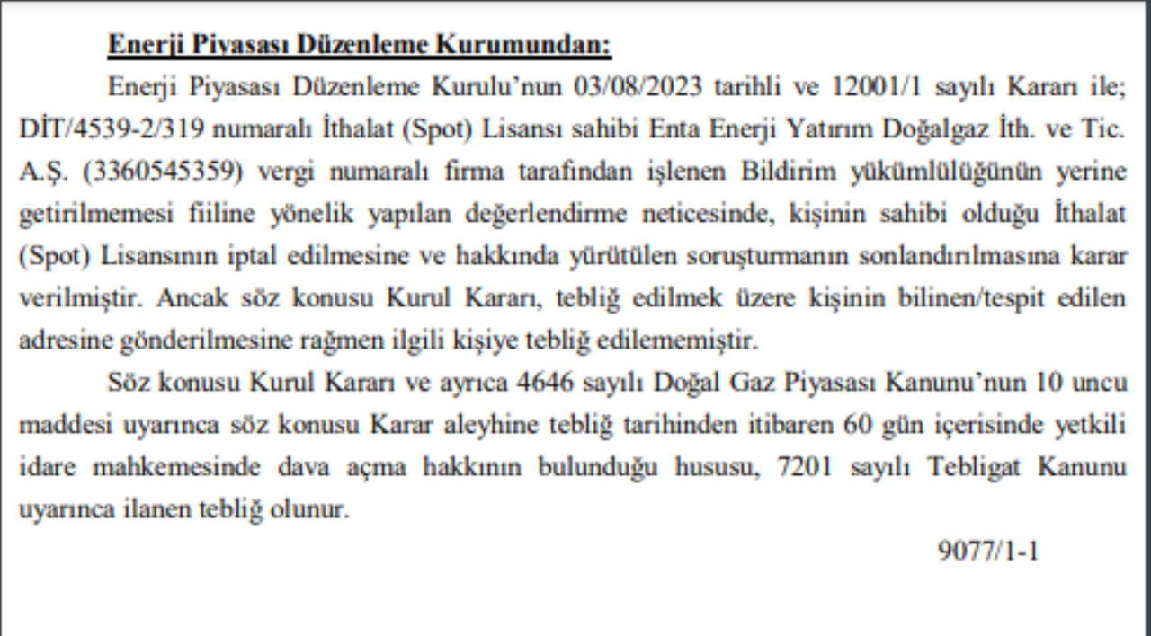 Enerji Piyasası Düzenleme Kurumu (EPDK), resmi bir duyuru ile ithalat lisansına sahip olan Enta Enerji Yatırım Doğalgaz İth. ve Tic. A.Ş. firmasının Bildirim yükümlülüğünü yerine getirmediği gerekçesiyle aldığı bir kararı duyurdu.