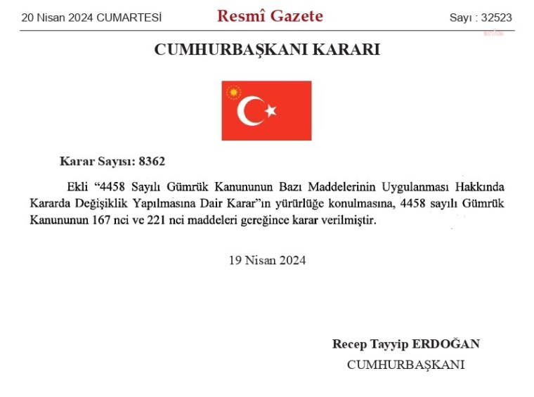 AKP Genel Başkanı ve Cumhurbaşkanı Recep Tayyip Erdoğan'ın imzasıyla 4458 sayılı Gümrük Kanunu'nun Bazı Maddelerinin Uygulanması Hakkında Kararda değişiklik yapılmasında dair karar, Resmi Gazete'de yayımlandı.