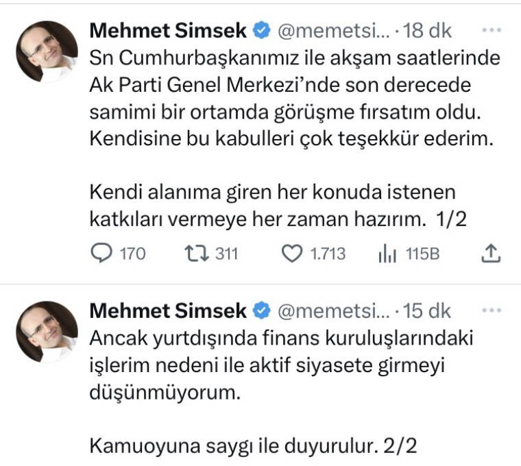 Ekonomi yönetiminin başına getirilen Hazine ve Maliye Bakanı Mehmet Şimşek, beş yıllık aradan sonra 2023 Mart ayında Erdoğan ile bir araya gelmişti. İlk görüşmenin ardından aktif siyasete dönmeyi düşünmediğini açıklayan Şimşek, "Yurtdışında finans kuruluşlarındaki işlerim nedeniyle aktif siyasete girmeyi düşünmüyorum" demişti. Ancak seçimden sonraki görüşmelerde ikna olan Şimşek, 4 Haziran 2023 tarihinden bu yana Hazine ve Maliye Bakanlığı görevini sürdürüyor.