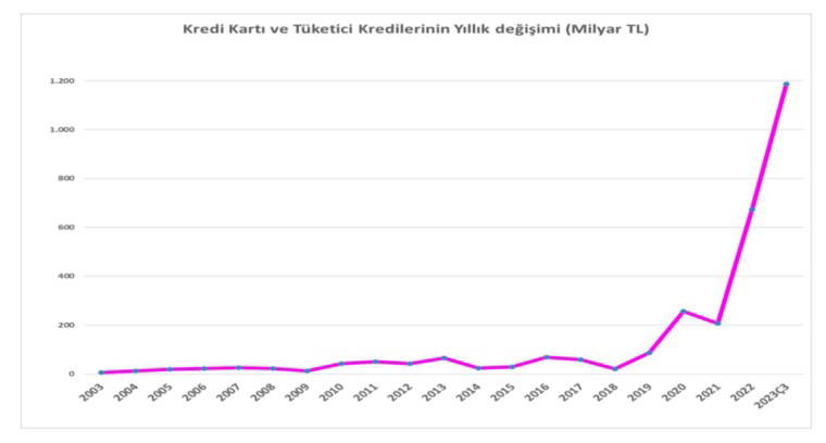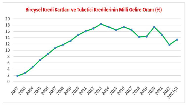3- Bireysel kredi kartları ve tüketici kredilerinin milli gelire oranı, 2002 yılında %2 civarındaydı. Bu oran 2013’te %18’e çıktı. 2023’ün üçüncü çeyreğinde %14 civarında bulunuyor. Ancak esas tablo, bunların nominal büyüklüğüne baktığımızda ortaya çıkıyor.