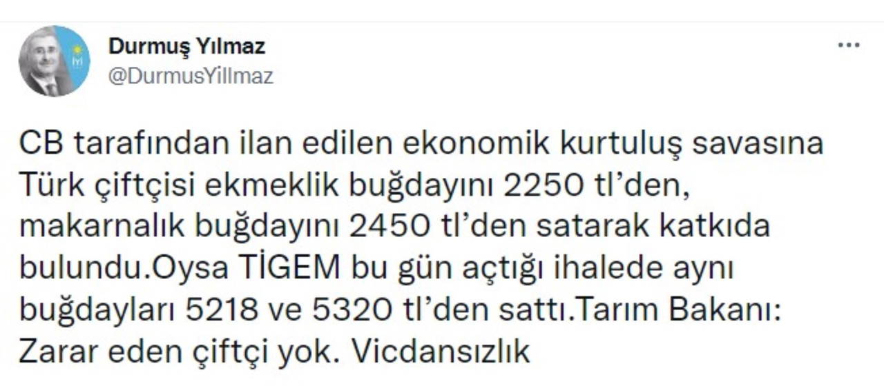 Buğday fiyatlarının artmasının ardından sosyal medya hesabından Erdoğan'ın ''ekonomik kurtuluş savaşı'' sözlerine tepki gösteren eski Merkez Bankası Başkanı Durmuş Yılmaz, ''Cumhurbaşkanı tarafından ilan edilen ekonomik kurtuluş savasına Türk çiftçisi ekmeklik buğdayını 2 bin 250 TL’den, makarnalık buğdayını 2 bin 450 TL’den satarak katkıda bulundu.Oysa TİGEM bu gün açtığı ihalede aynı buğdayları 5 bin 218 ve 5 bin 320 TL’den sattı.Tarım Bakanı: Zarar eden çiftçi yok. Vicdansızlık'' ifadelerini kullandı.