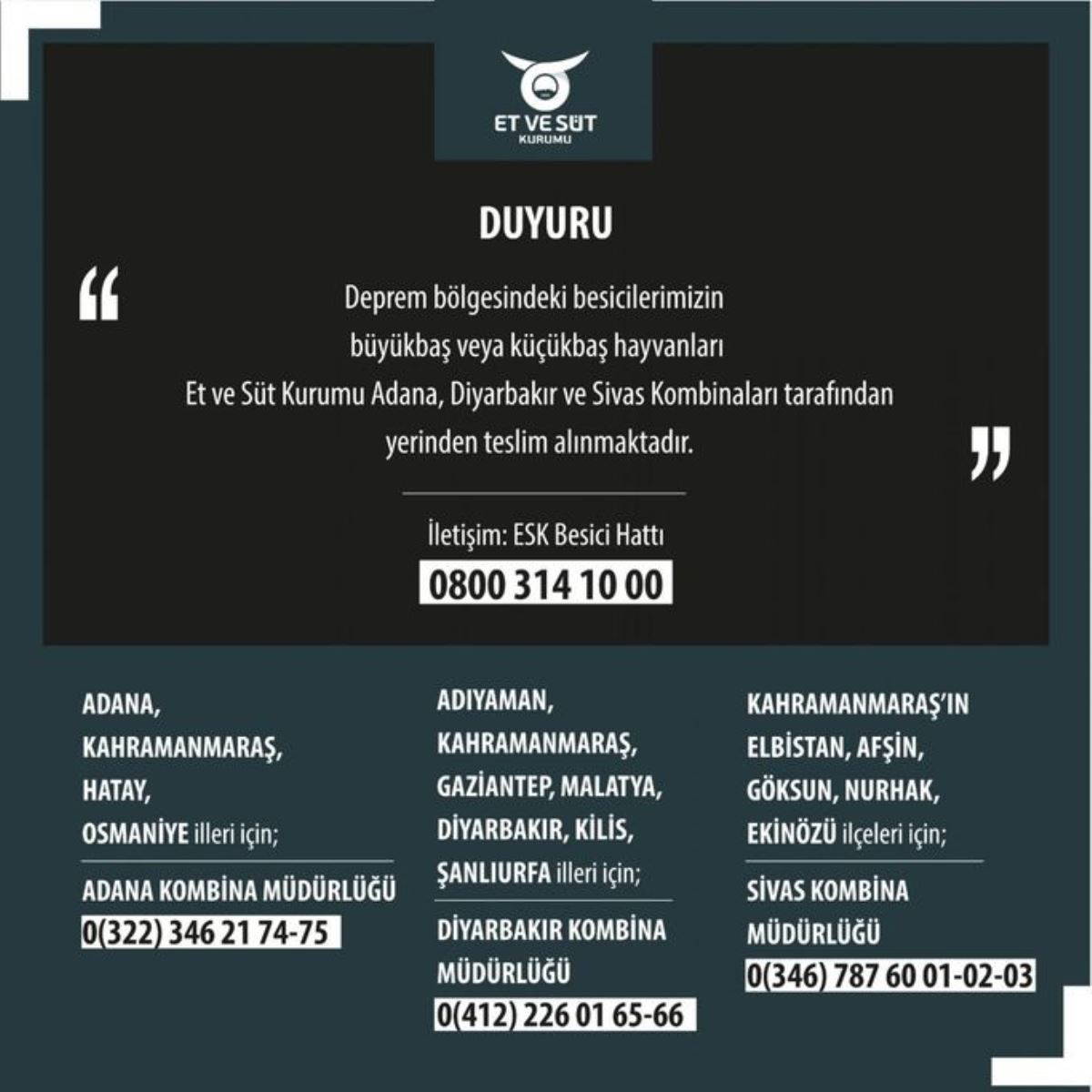 "Deprem bölgesindeki besicilerimizin büyükbaş veya küçükbaş hayvanları Et ve Süt Kurumu Adana, Diyarbakır ve Sivas Kombinaları tarafından yerinden teslim alınmaktadır.
