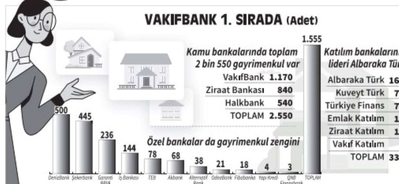 Bankaların resmi internet sitelerinde yer alan bilgilere göre kamu bankalarında halen satılık toplam 2 bin 550 gayrimenkul var. VakıfBank el koyduğu 1170 gayrimenkulle başı çekerken Ziraat Bankası’nın elinde 840, Halkbank’ın elinde 540 satılık gayrimenkul var. Özel bankalarda ise toplam 1555 gayrimenkul bulunuyor. Bu kapsamda DenizBank 500 gayrimenkulle ilk sırada yer alırken Şekerbank’ta 445, Garanti BBVA’da 236, İş Bankası’nda 144, TEB’de 78, Akbank’ta 68 satılık konut bulunuyor. Katılım bankalarının elinde ise toplam 339 gayrimenkul var. Albaraka Türk 162 gayrimenkul ile ilk sırada yer alırken Kuveyt Türk ve Türkiye Finans’ın elinde 70’er gayrimenkul bulunuyor. Tarımsal kredilerde ön plana çıkan Ziraat Bankası ve Şekerbank’ta satılık tarlaların sayısı yüksek.