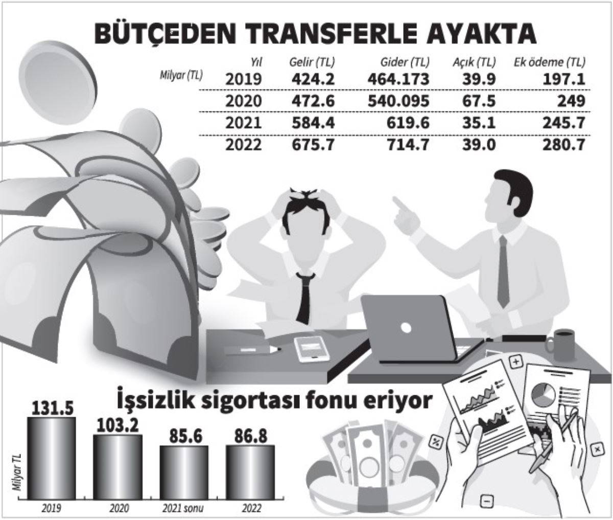 İktidarın her fırsatta CHP Genel Başkanı Kemal Kılıçdaroğlu’nu görevde olduğu dönemde batırmakla suçladığı Sosyal Güvenlik Kurumu’nda (SGK) açıklar katlanarak büyüyor. Gelecek yıl kurumun açığı 39 milyar TL’ye çıkacak. Açık içerisinde gösterilmese de kuruma bütçeden 280.7 milyar TL aktarılacak. Bir zamanlar 132 milyar TL kaynak bulunan İşsizlik Sigortası Fonu ise gelecek yıl ancak 86.8 milyar TL kaynağa sahip olacak.