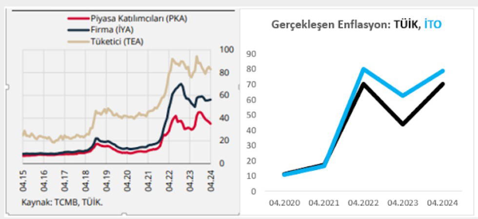 “Merkez Bankası’nın 2024 yılı II. Enflasyon Raporu’nda 2015 yılı Nisan ayından başlayarak her yılın Nisan aylarında 12 aylık temelde enflasyon oranının yüzde kaç olacağına ilişkin piyasa katılımcıları, firma temsilcileri ve tüketicilerin tahminlerini gösteren bir grafik yer alıyor (Sayfa 57, Kutu 3.1.) Bu grafiği rapordan aynen alıyorum (sol taraftaki grafik.) Sağ taraftaki grafik de TÜİK’in tüketici enflasyon oranına (TÜFE) ve İstanbul Ticaret Odası’nın (İTO) İstanbul Ücretliler Geçinme Endeksine göre oluşturulan ve 2020’den 2024’e kadar her yılın Nisan aylarında gerçekleşen 12 aylık enflasyon oranlarını gösteriyor.