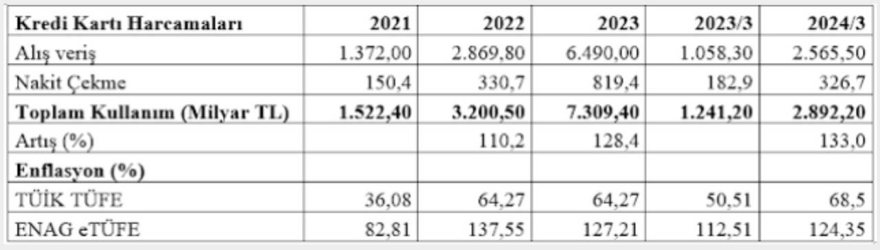2023 yılında 2022 yılına göre yerli kredi kartlarının yurtiçi kullanım tutarları yüzde 128,4 artmış. 2024 yılının ilk üç ayında kredi kartı kullanımı artışı yüzde 133’e yükselmiş. Buna karşılık TÜİK TÜFE’deki artışlar kredi kartı kullanım artışının yarısında kalmış. Oysa ENAG’ın eTÜFE artış oranları kredi kartı kullanım artışı oranlarına çok daha yakın olmuş. Hatta 2023’de eTÜFE ile kredi kartı kullanım oranı artışı neredeyse bire bir tutmuş.