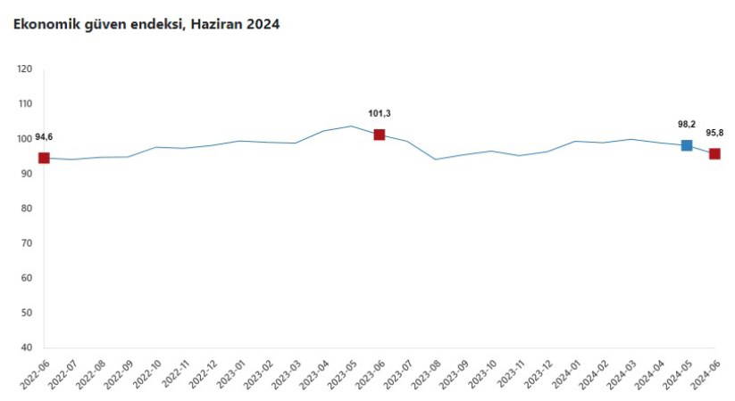 Tüketicilerin ekonomiye ve kendi mali durumlarına olan bakış açılarını ölçmek için kullanılan Ekonomik Güven Endeksi mayıs ayında 98,2 iken haziran ayında yüzde 2,5 oranında azalarak 95,8 değerini aldı.