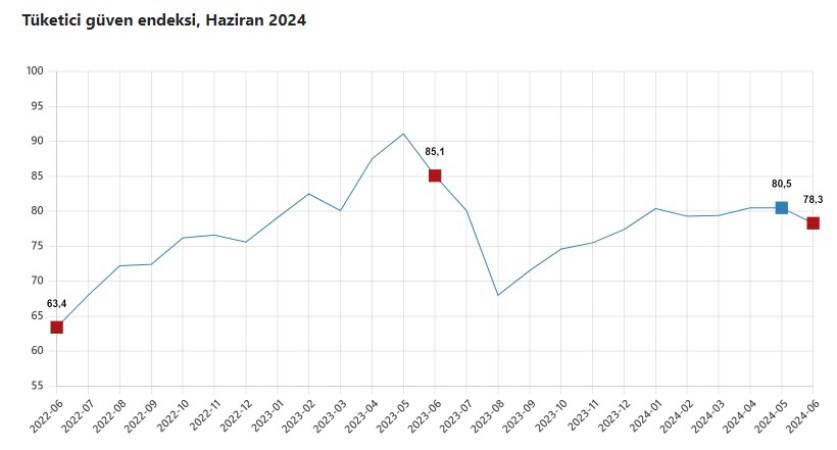 Tüketicilerin önümüzdeki 6 ay veya 1 yıl içinde ekonominin nasıl gelişeceğine dair beklentilerini ifade eden ve gelecekteki harcama ve tasarruf planlarını belirten Tüketici Güven Endeksi de mayıs ayında 80,51 iken haziran ayında yüzde 2,7 oranında azalarak 78,3 oldu.