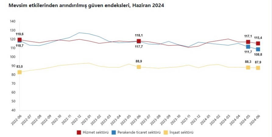 Haziran ayında güven endeksi hizmet sektöründe yüzde 1,5 perakende ticaret sektörü yüzde 2,6 inşaat sektörü de yüzde 0,5 azalış kaydetti.