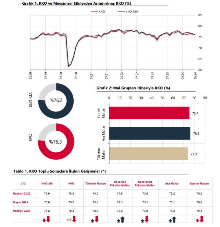 Haziran 2024 için imalat sanayi genelinde mevsimsel etkilerden arındırılmış Kapasite Kullanım Oranı'nın (KKO-MA) bir önceki aya göre 0,4 puan azalarak yüzde 76,2 seviyesine düştü. Mevsimsel etkilerden arındırılmamış Kapasite Kullanım Oranı (KKO) ise bir önceki aya göre değişmeyerek yüzde 76,3 seviyesinde kaldı.
