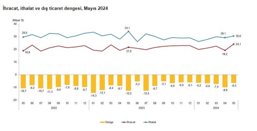 Verilere göre, ihracat 2024 yılı mayıs ayında, bir önceki yılın aynı ayına göre yüzde 11,3 artarak 24 milyar 66 milyon dolar, ithalat yüzde 10,4 azalarak 30 milyar 568 milyon dolar olarak gerçekleşti.