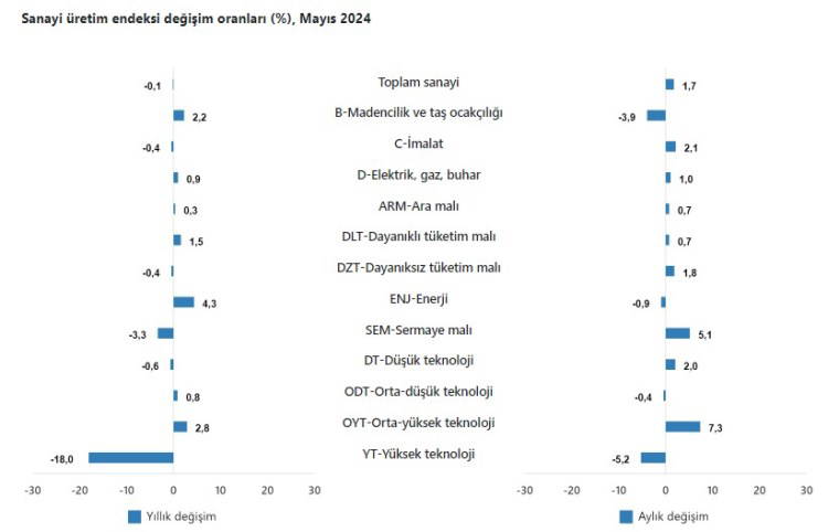 Sanayi üretim endeksi mayısta aylık yüzde 1,7 arttı, yıllık yüzde 0,1 azalış kaydetti. Veriler bir soğumadan bahsetmek için henüz yeterli olmasa da endekste hem olumlu hem de bazı olumsuz sinyaller mevcut.
