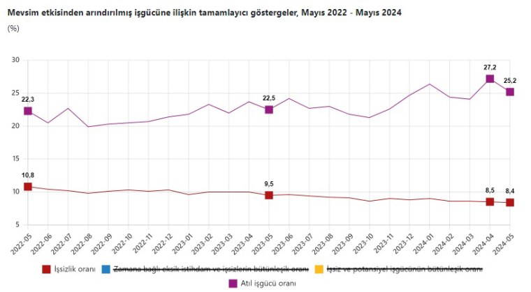 Zamana bağlı eksik istihdam, potansiyel işgücü ve işsizlerden oluşan atıl işgücü oranı bir önceki aya göre 2,0 puan azalarak yüzde 25,2 seviyesinde kaldı.